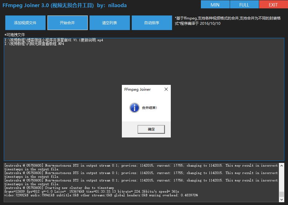 FFmpegJoiner最新版是一款可以对视频进行无损合并的强大软件.可以对目前所有视频格式进行无损合并,而且不影响视频的清晰度.软件能够加载多个视频文件进行批量操作,提供无损合并,新的文件不会造成任何损失,支持多种常见的视频格式操作。