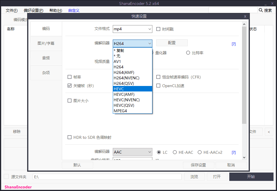 ShanaEncoder,H265高清视频编码压制软件,堪称最强视频压制软件,支持CPU多线程和GPU加速,转换速度快清晰度高,B站指定压制工具。ShanaEncoder是由韩国人基于FFmpeg开发的一款音视频编码程序,支持H.264解码器编码、Unicode编码,采用自定义命令行方式快速设置参数配置,压制H265编码视频时,编解码器NVENC的速度最快,但同码率下视频质量较差,其次是QSV的速度,视频画质质量不错推荐。