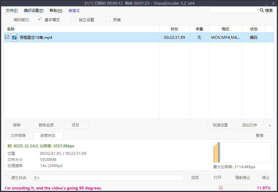 一个原码率11000Kbps的H264视频,时长20多分钟,体积1.74GB,帧率为59.94(大多数视频可能只有30/29.97或者24/23.976,多一倍帧率就多一倍体积)。