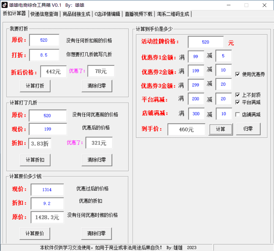 拥有折扣计算器、快递信息查询、商品链接生成、C店详情编辑、直播视频下载、淘系二维码生成功能