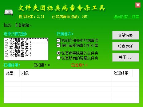 这是一款非常专业实用的文件夹图标类病独专杀工具,它能够快速扫描电脑本地中已存在的病独进行查杀,并将已经被更改为EXE的病独文件修复回来。