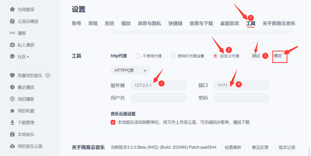 最后打开某抑云音乐平台了,在工具栏里选择自定义代理,输入服务器和端口数据(安装证书的步骤里会显示)