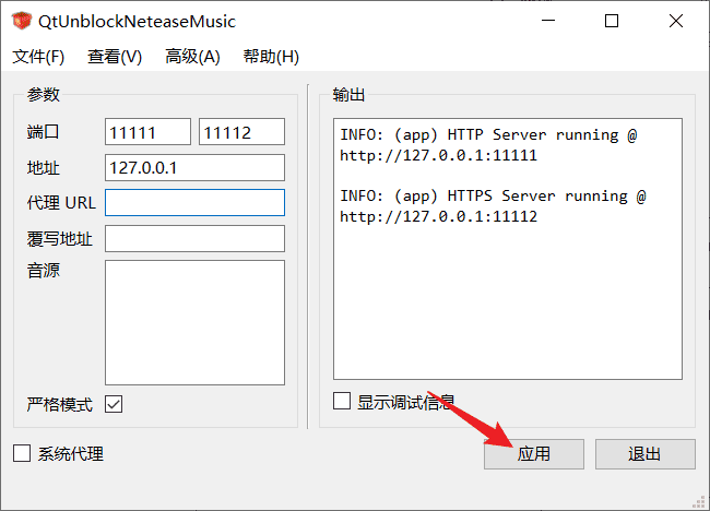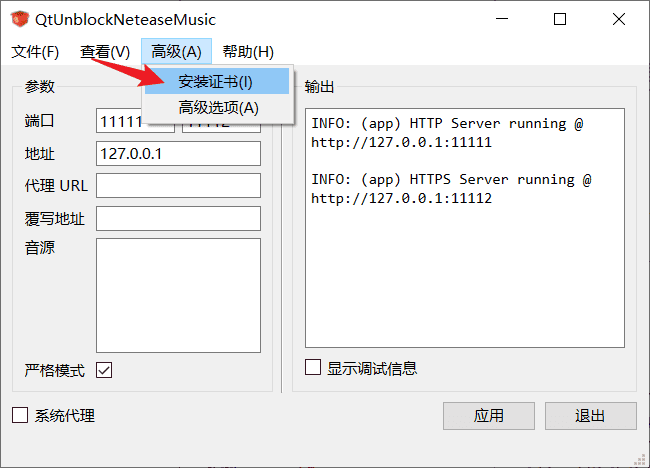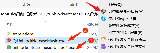 下载解压后,鼠标右键“以管理员身份依此按顺序运行”unblockneteasemusic-win-x64和QtUnblockNeteaseMusic应用程序,并且挂载在后台不要关闭