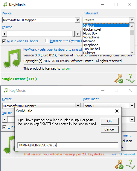 KeyMusic是一款用键盘弹奏和制作音乐的工具,可以让你通过按键就能随手演奏音乐,内置钢琴、大提琴、风琴、口琴、小提琴等乐器的声音,你可通过Instrument来选择乐器,在Tone中选择曲调,Volume中调节音量大小。