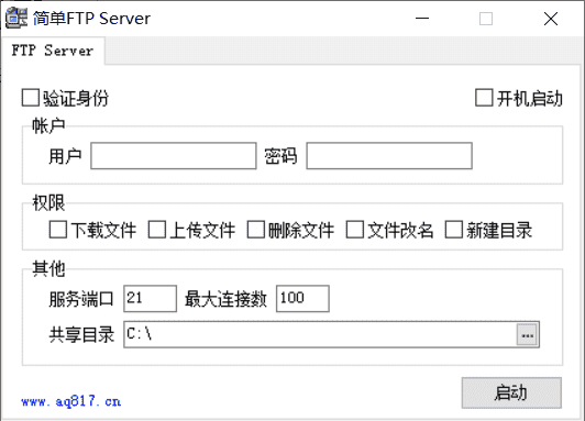 在一台电脑上运行简单FTP Server软件,勾选验证身份,账户、密码自定义,勾选相关权限,服务端口默认21,设置一个存在的用来上传下载的共享目录,点击启动