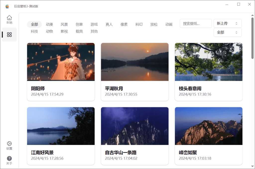 巨应壁纸 3 LiveWallpaper是一款很棒的桌面壁纸软件,巨应壁纸为用户提供了静态或者动态壁纸,涵盖了动漫、风景、影视以及像素等诸多类型的,通过动态的壁纸资源内容,将你的电脑桌面进行装扮,使得桌面更加的富有灵动性,甚至可以将你本地的视频文件内容,快速的导入其中,设定为专属的动态壁纸,打造独一无二的效果。感兴趣的可以试试这款LiveWallpaper壁纸资源/巨应壁纸下载。