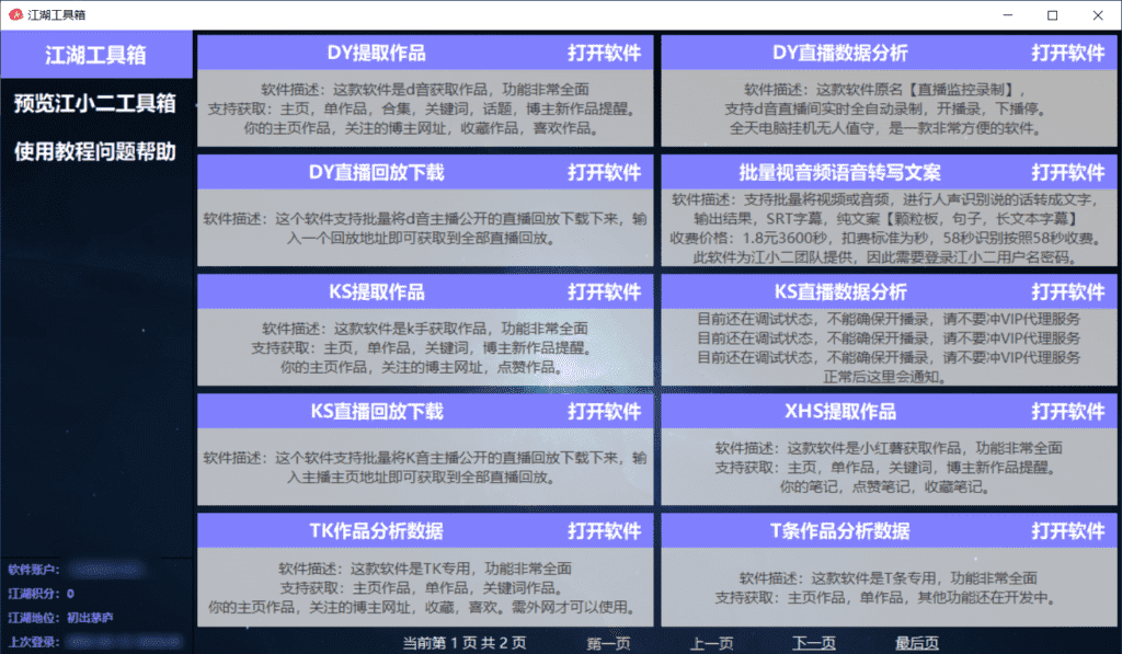 江湖工具箱是一款免费的抖音批量下载与抖音去水印工具,抖音批量下载工具比较强,支持单个作品下载、主页作品下载、主页喜欢下载、直播解析、单个合集下载、主页所有合集下载、音乐(原声)集合下载等等,而且软件内置使用教程和操作指导帮助,对于玩抖音的做自媒体的用户是一款非常不错的辅助工具,感兴趣的可以试试这款江湖工具箱下载。