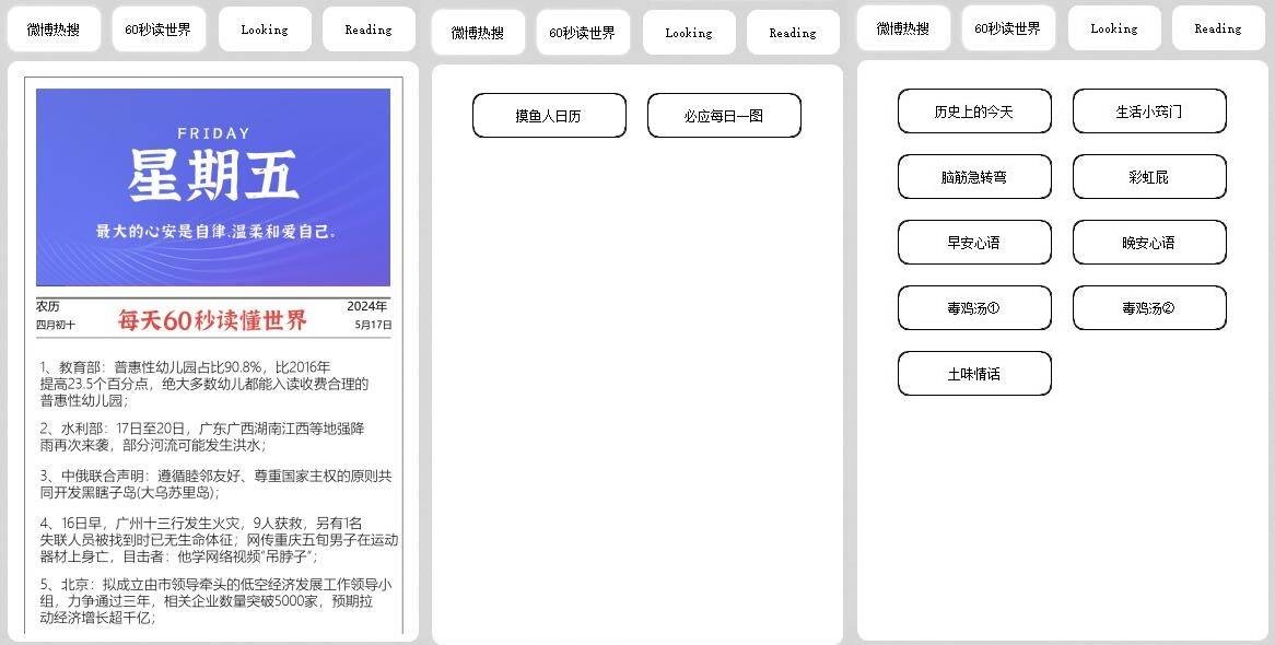 集成了日期时间显示、天气预报、工作日判断、喝水记录、微博热搜查询、60秒读世界新闻以及其他各种实用小工具等功能,喜欢的可以尝试一下。