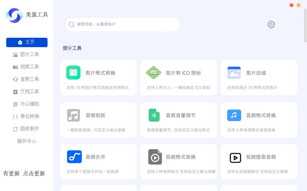 美蛋工具 是一款多功能的工具箱软件,它采用了易语言进行编写。这款软件集成了多种实用工具,包括图片工具、视频工具、文档工具、音频工具、办公辅助以及单位转换等。用户可以通过图片工具对图片进行编辑、格式转换、图片压缩等等。视频工具可以对视频进行翻转、提取音频、分辨率转换等等。还有很多功能用户可以自行体验。