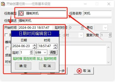 如果你想搞一个定时关机的任务,只需要选择「强制关机」,然后双击选择任务生效的开始时间,还可以配置延时。