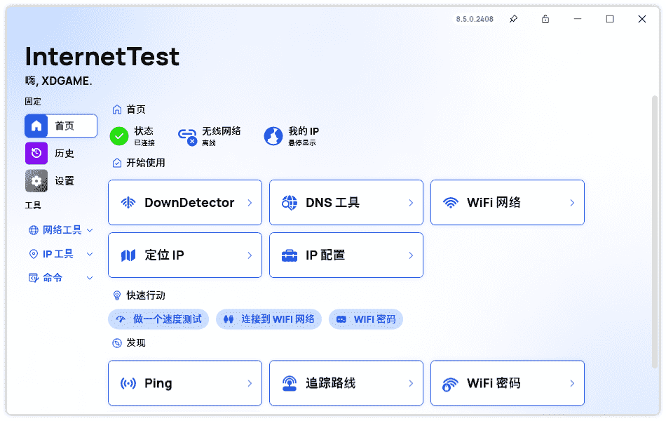 InternetTest Pro 是一款专为 Windows 用户设计的功能强大且现代化的连接实用程序。它旨在帮助用户监控和优化他们的互联网连接体验,以确保他们能够充分利用网络资源。软件的主要功能包含:检查互联网连接、执行速度测试、网站可用性检查、DNS信息检索、附近的 WiFi 网络信息、IP地址显示、路由追踪功能、WiFi密码恢复等等。