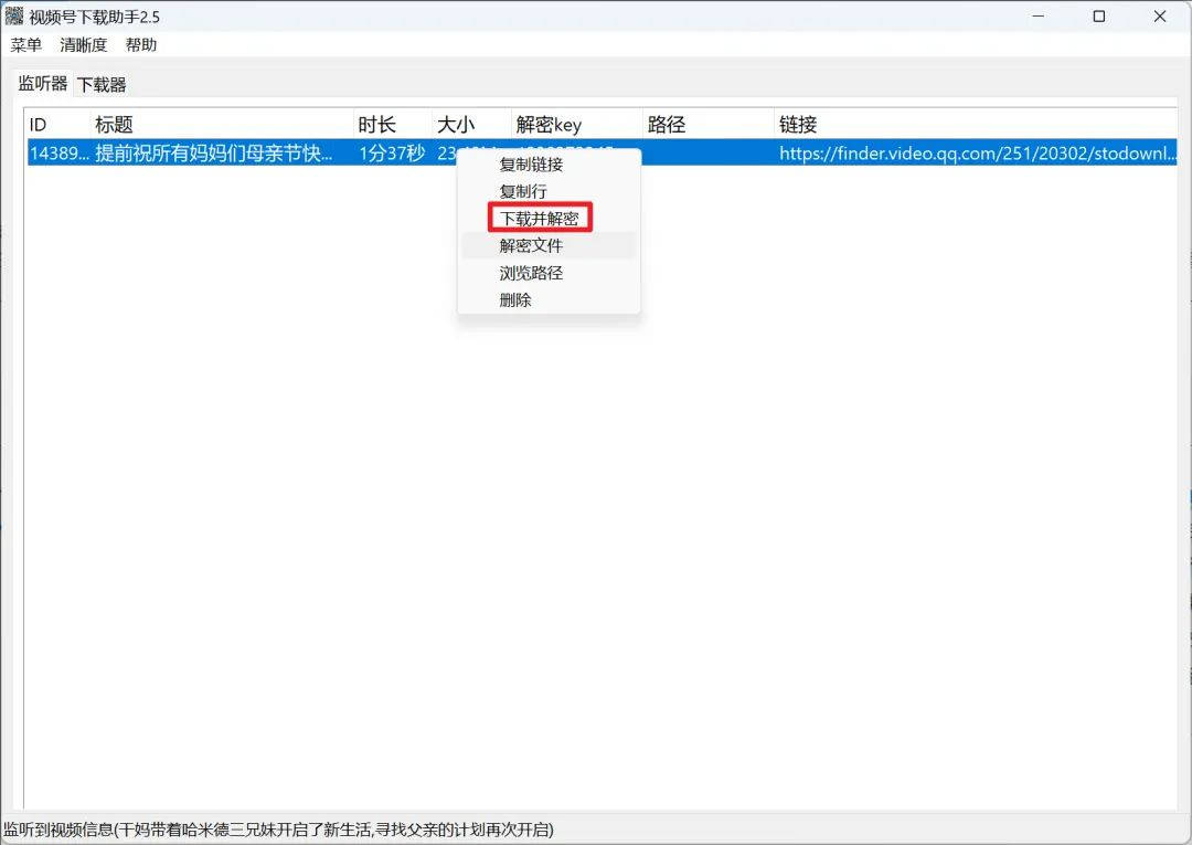 启动以后再在电脑端打开VX视频号播放视频,然后软件就开始捕获下载地址。