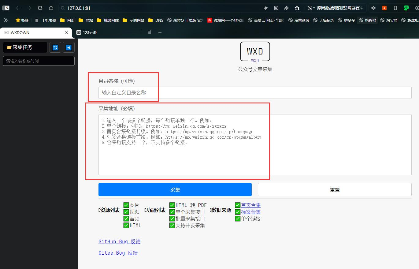 打开后会跳转到浏览器中,以浏览器本地方式打开工具,这里的【输入目录名称】,就是下载后保存文件夹的名称,可以随便填也可以不填,最好是填文章标题,这样后期方便查找。