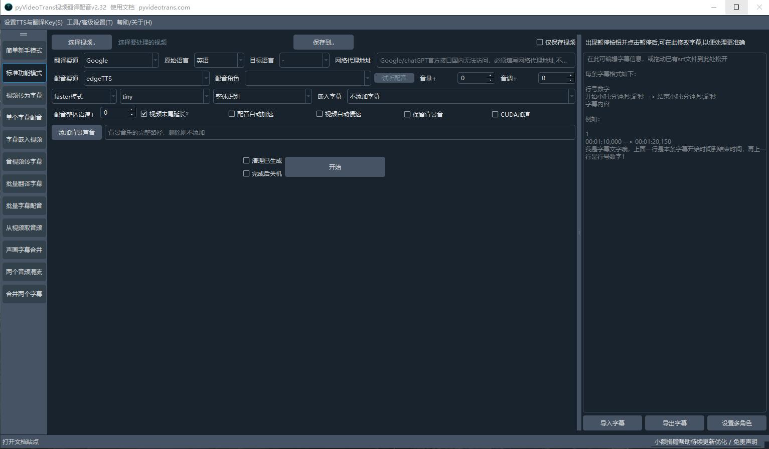 VideoTran是一个视频翻译配音工具,可将一种语言的视频翻译为指定语言的视频,自动生成和添加该语言的字幕和配音。语音识别使用 faster-whisper openai-whisper 离线模型。文字翻译支持 microsoft、google、baidu、tencent、ch*tg*t、Azure、Gemini、DeepL、DeepLX、离线翻译OTT。文字合成语音支持 Microsoft Edge tts Openai TTS-1 Elevenlabs TTS 自定义TTS服务器api ,配合clone-voice 可实现原音色克隆配音。允许保留背景伴奏音乐等(基于uvr5)。