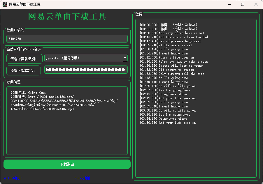 网易云单曲下载工具是一个基于 PyQt5 的桌面应用程序,专门用于下载网易云音乐的单曲。你只需输入网易云音乐的歌曲 ID,选择所需音质,并提供 MUSIC_U cookie,即可轻松下载心仪的歌曲。
