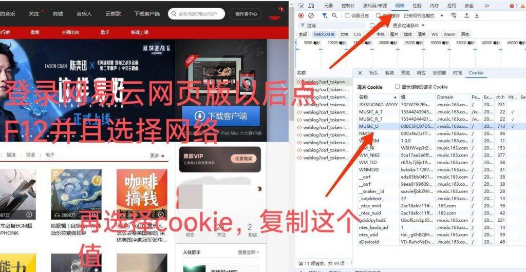 获取 MUSIC_U Cookie:请先登录网页版的网易云音乐,从浏览器中获取你的 MUSIC_U Cookie