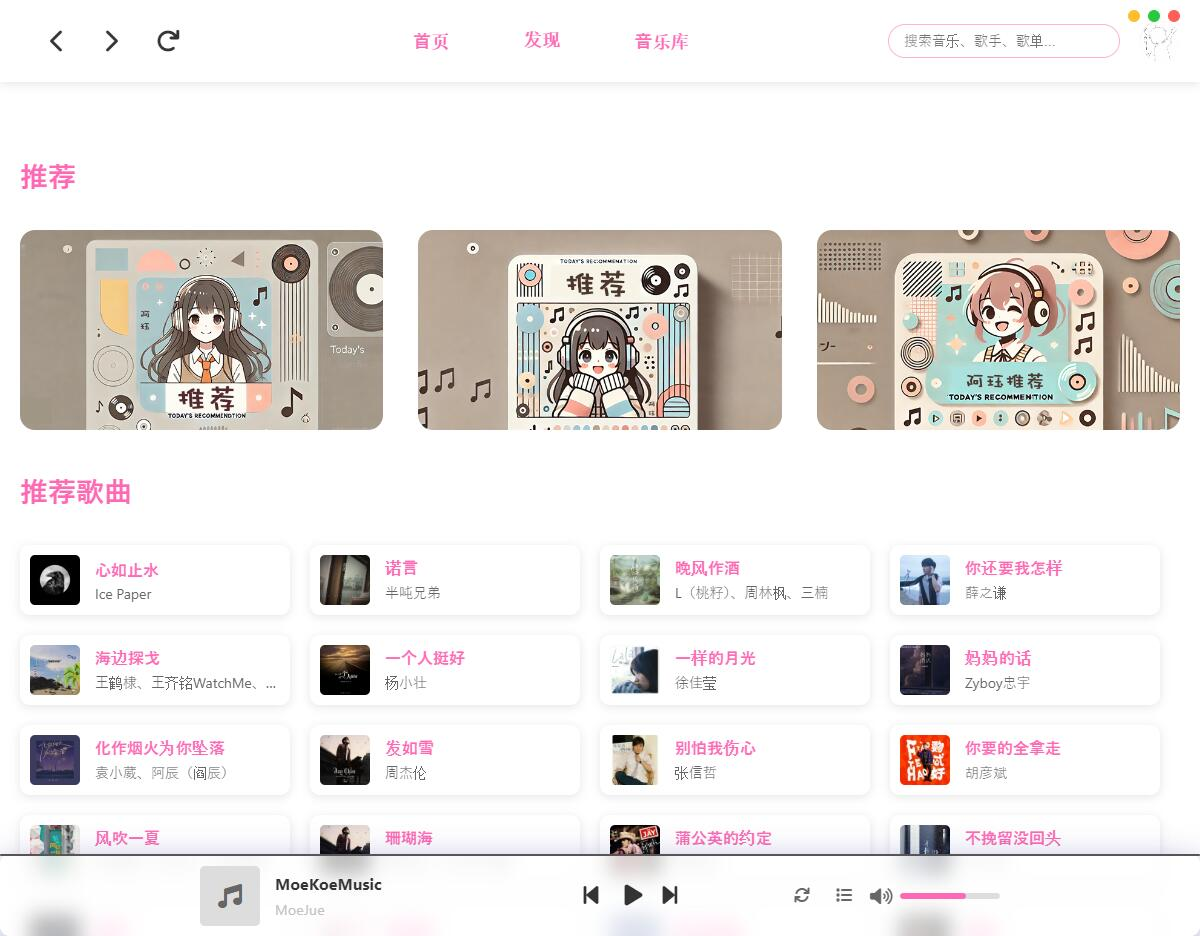 MoeKoeMusic是一款由iAJue开发的开源、简洁高颜值的某狗第三方客户端,很明显,二次元风格,支持Windows、macOS 和Linux多平台。