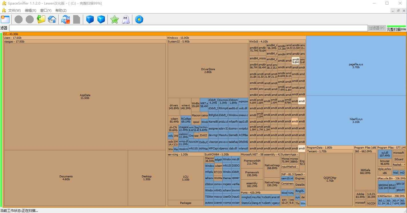 运行之后选择你的系统盘,SpaceSniffer会自动分析所有文件,从大到小依次排列。