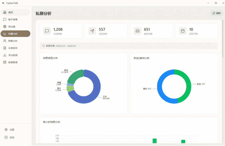在数据洞察方面,密语 CipherTalk 提供了专业的数据可视化分析。通过图表形式直观展示聊天数据,包括消息统计、活跃时段分析、词云分析等,帮助你深度洞察自己的聊天习惯,发现那些被忽略的沟通模式。