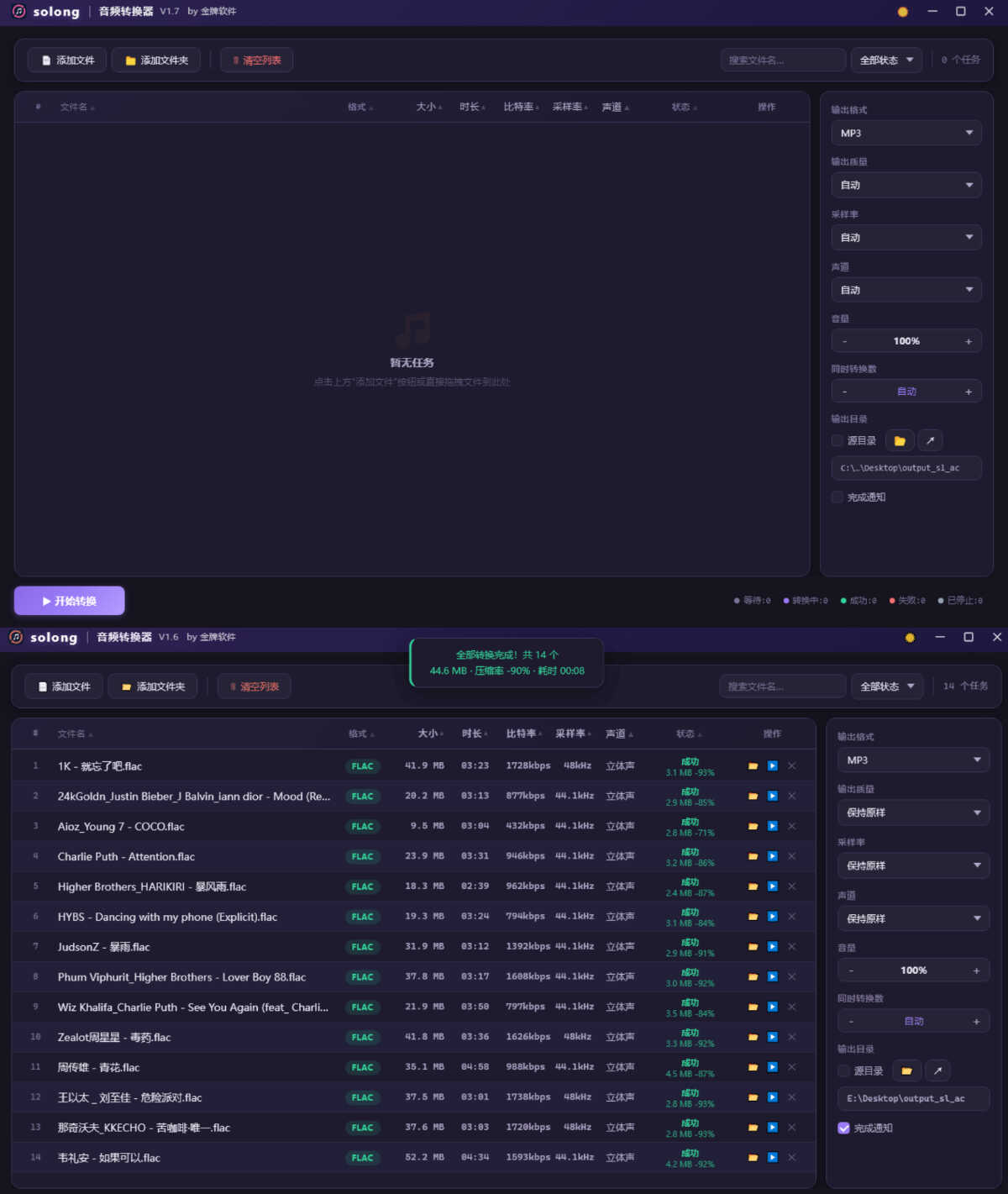 音频批量转 — 拖文件或文件夹,几百个一次搞定。