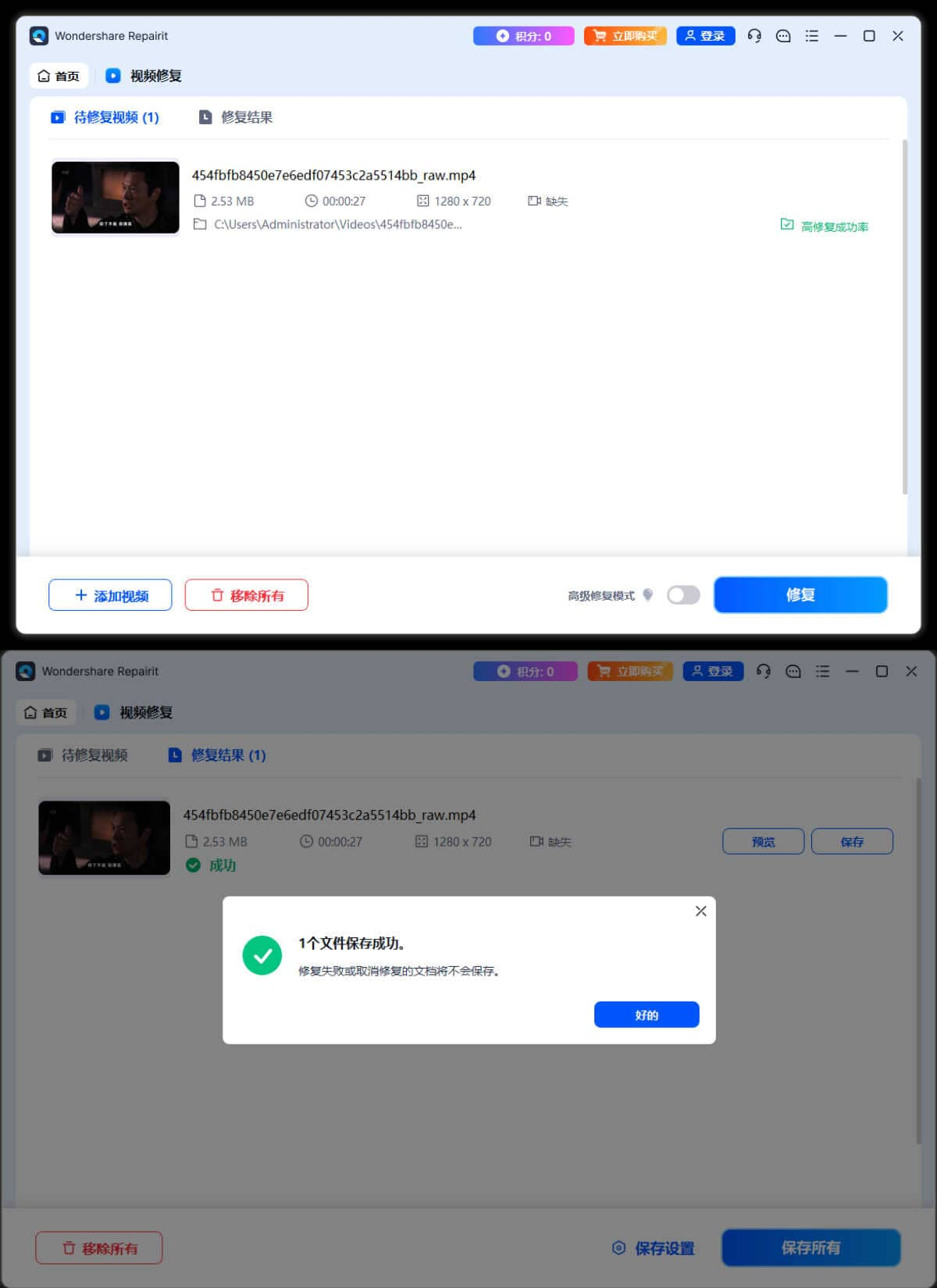 Wondershare Repairit 是一款专业的视频修复软件,可以修复各种视频文件中的损坏、损失、花屏、马赛克等问题,让您的视频恢复到正常状态。