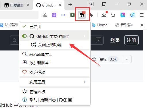 步骤三:安装后,当你再打开github的网址,就会在油候脚本管理器中看到GitHub 中文化插件 一起用,github的网页也会变成中文。