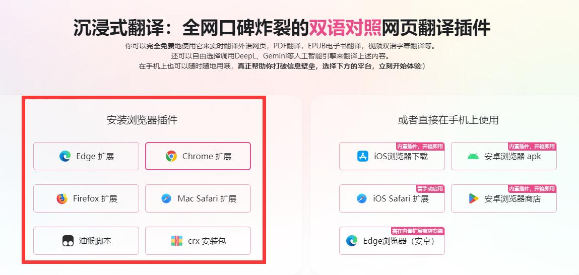 正式使用之前,需访问沉浸式翻译插件网页,根据自己的浏览器版本,点击安装按钮,跳转至插件安装界面。
