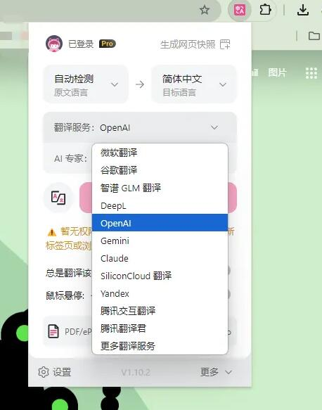 谷歌翻译、智谱GLM翻译、DeepL、OpenAI、Gemini、Claude、SiliconCloud、Yandex、腾讯交互翻译、腾讯翻译君等十多个知名翻译工具和AI都已经接入插件,选择即可调用。