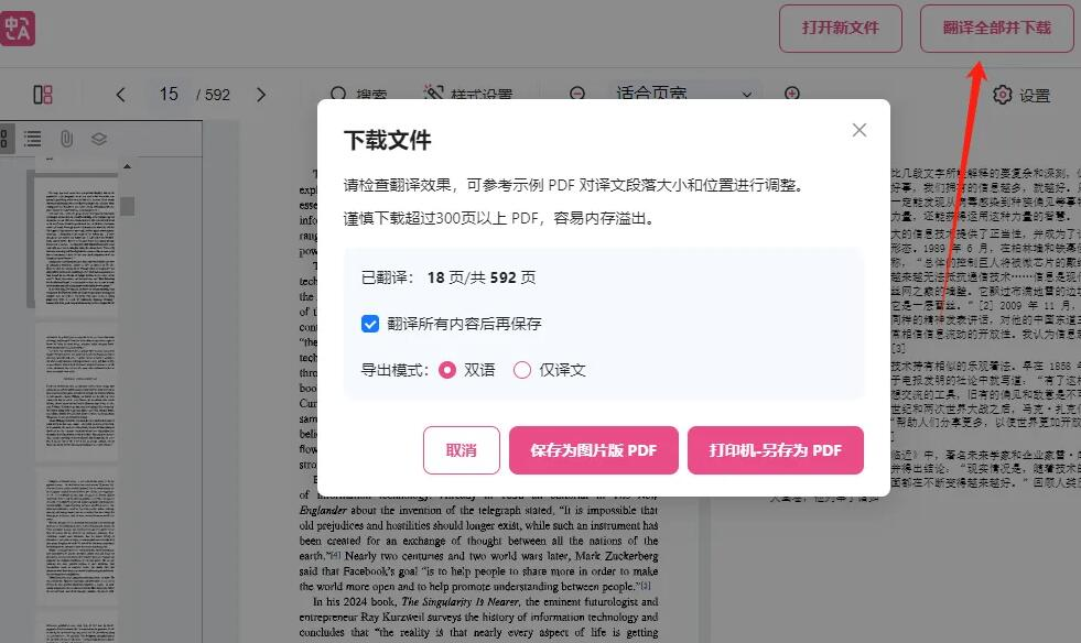 选择好自己需要的翻译服务后,可以点击翻译并下载全部,将整份文档翻译为中文。