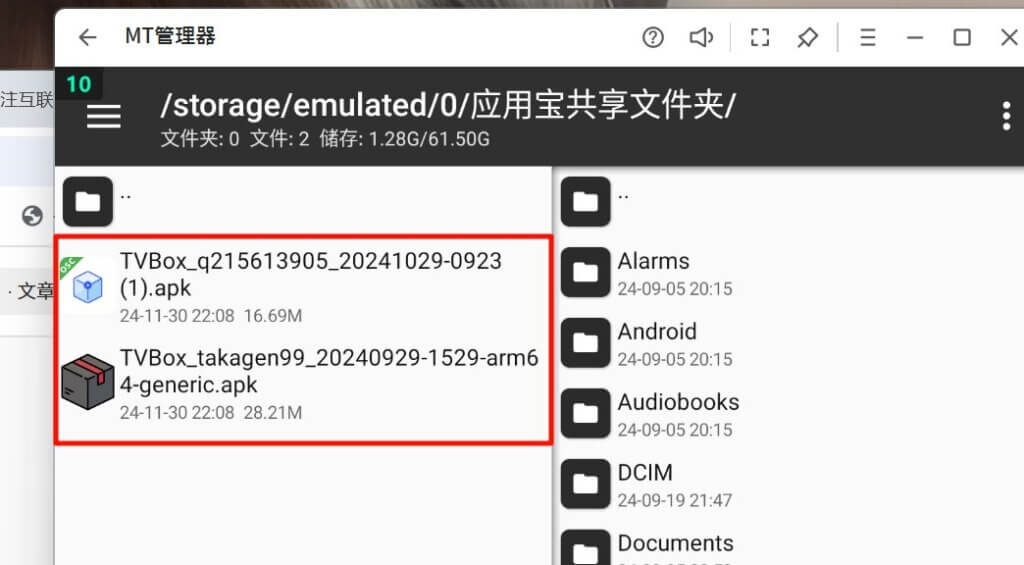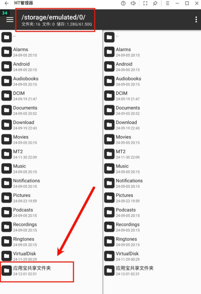 4,打开我们第一步安装的“MT管理器”,打开后默认定位在/storage/emulated/0/目录下,找到”腾讯应用宝共享文件夹”,然后打开!