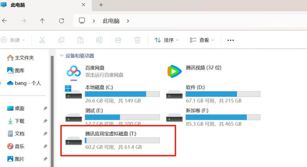 2,打开我的电脑,你会看到名字叫“腾讯应用宝虚拟磁盘”的单独磁盘。(如果看不到可以尝试重启应用宝)