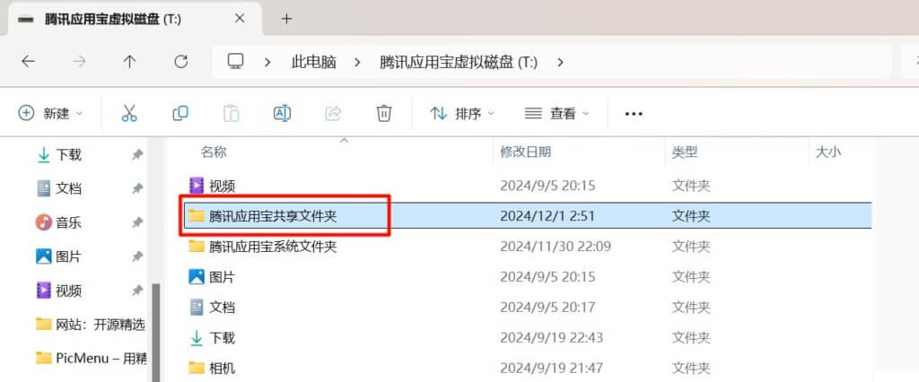 3,进入这个磁盘,然后找到名为“腾讯应用宝共享文件夹”的文件夹,将你需要安装的APP的.APK文件复制到这个文件夹内。
