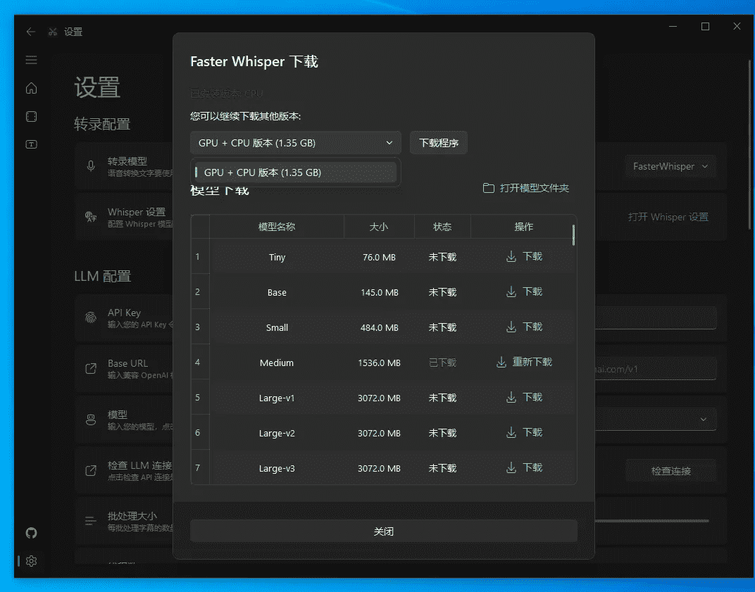 先看本地的Whisper模型,使用前需要先根据配置安装GPU+CPU使用或者CPU使用的模型底包,然后下载用于识别的模型。模型体积越大,识别效果也就越好,但对设备性能的要求也在提高。