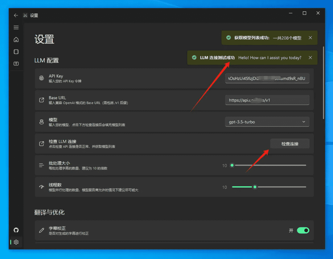 填入API Key、Base URL后,点击检查连接,当弹出模型获取成功、LLM连接成功的提示时,就说明大模型接入成功!
