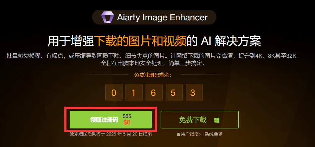 好消息!Aiarty Image Enhancer 限时免费赠送啦!无论是 Windows 还是 Mac 用户,只需输入邮箱即可直接领取正版授权。活动还剩 7天,需要的朋友抓紧参与!