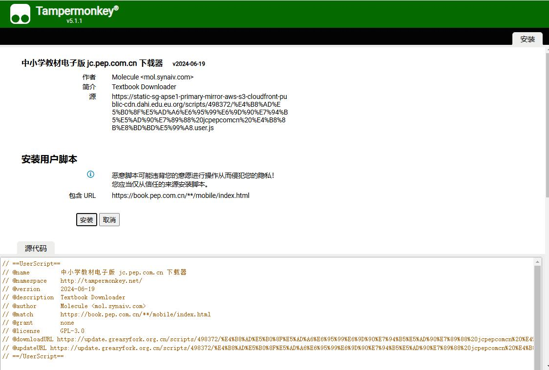 2,通过这个地址“https://home.greasyfork.org.cn/zh-hans/info/#/zh-CN/scripts/498372/detail”安装“中小学教材电子版”下载器脚本