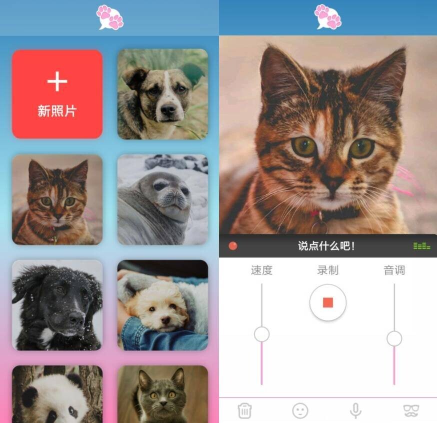 我的宠物会说话VIP版(车机版), 内置了几十个动物照片 ,可以直接用它的素材让动物开口说话!
