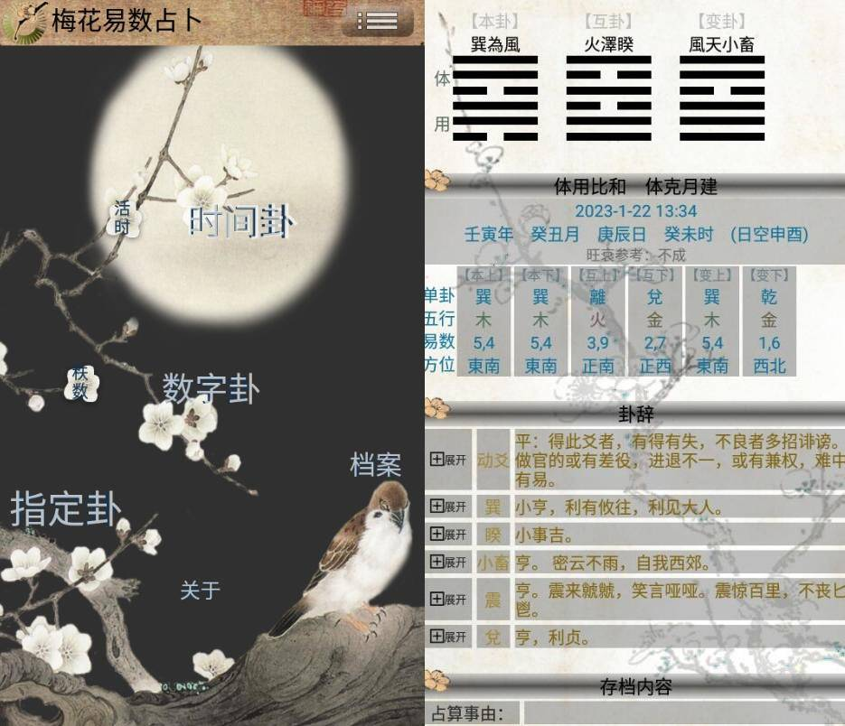这是一个专业《易经》占卜工具,所提供功能和资料都面向有一定基础的易学爱好使用者。 正如刚才所说,这是专业“梅花易数”工具,那种游戏式叫你甩甩手机告诉你大吉还是大凶的程式,是不可比拟的。相传梅花易是宋朝邵康节发明,因万物都走不出八卦五行范围,故此万物都可以其八卦五行属性起卦,再从卦像占卜结果。只要占者心动,无论声音、方位、时间、人物、动植物、汉字都可以入卦。具体不介绍了。