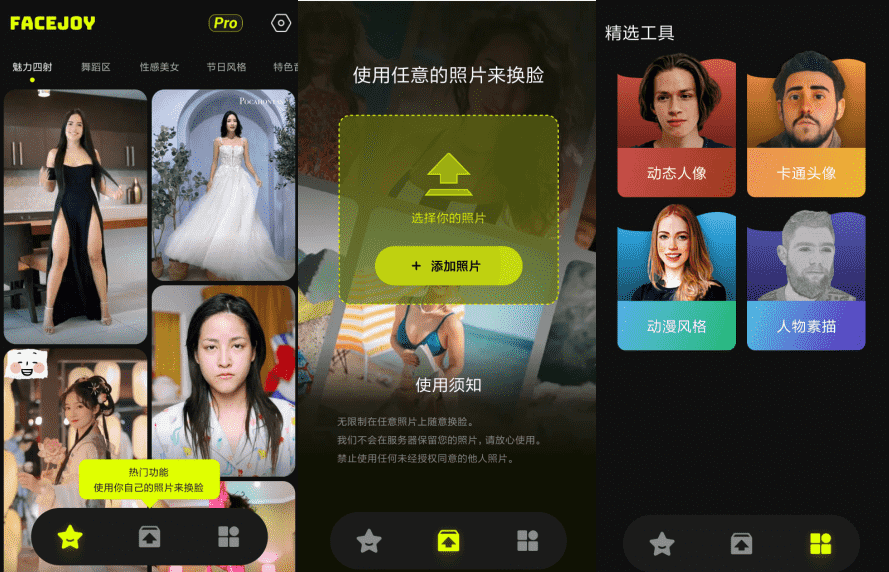 一款非常有趣的图片编辑软件,软件内拥有十分独特的系统和ai程序功能,可以帮助用户们实现换脸的操作。用户们下载软件后就可以在软件内编辑自己的照片和图片,它可以快速的改变人物的面部特征,支持变脸、换脸、脸部编辑等多种功能,而且软件内还为大家准备了非常多有趣的特效,能够利用自己的五官长相来设置各种动图表情,用户们在线就可以免费操作和使用,喜欢的用户们快来下载使用吧!