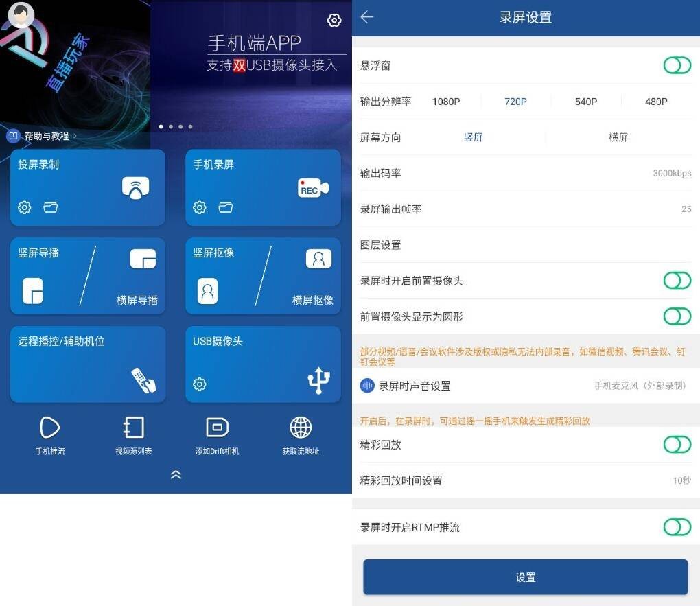 V导播录屏App是一款强大的视频直播应用软件,能够让用户在App里面轻松的添加各种直播应用,比如比赛计分板,还有各种活动的标题等,字幕添加。拥有视频采集,画面处理,直播推流3大功能,V导播录屏APP用户可以通过手机摄像头,或者购买禾苗编码棒,禾苗编码盒等设备来连接各种HDMI视频源(如摄像机,运动相机,无人机,机顶盒等)。此外V导播录屏APP 用户还可自行填入推流地址后(比如熊猫,斗鱼等知名直播空间),即可进行直播。