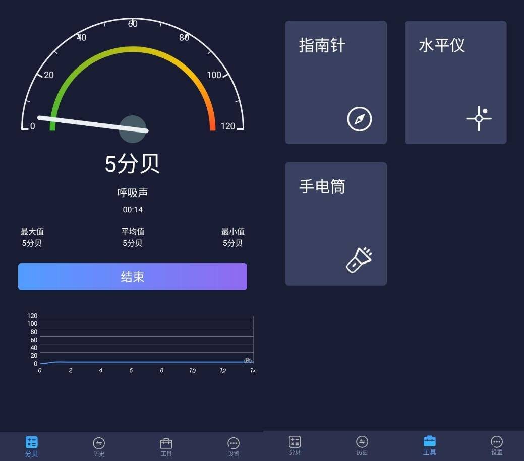 分贝测量,噪音检测,分贝测量仪,分贝仪,噪音测量,精准显示噪音分贝dB数*,家用电器、空调、冰箱、热水器噪音大小全掌握。一键分享,历史记录,更有丰富工具箱指南针、水平仪、手电筒等方便使用!
