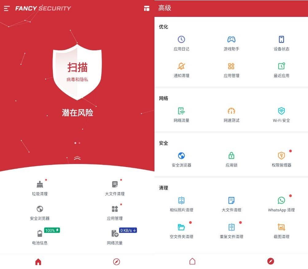 Fancy Security是一款功能强大的手机杀毒清理工具,软件拥有先进的杀毒引擎和实时监控功能,可以帮助您检测和清除手机中的病毒、恶意软件和广告插件。它不仅能实时扫描下载的应用程序和文件,还能定期对手机进行全面扫描,确保您的手机始终保持在一个安全的状态。这是一款强大而可靠的手机杀毒清理工具,为用户提供全方位的手机安全保护和优化服务。