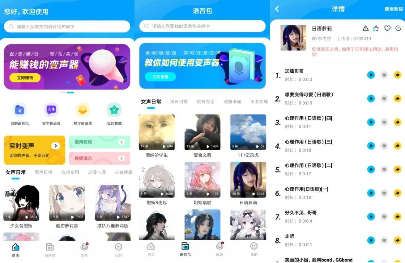 内含精品语音包,素材包括李云龙、小猪佩奇、萝莉,等精品语音包,还有男变女、女变男、大叔变萝莉、小孩变型男等特效实时变声功能