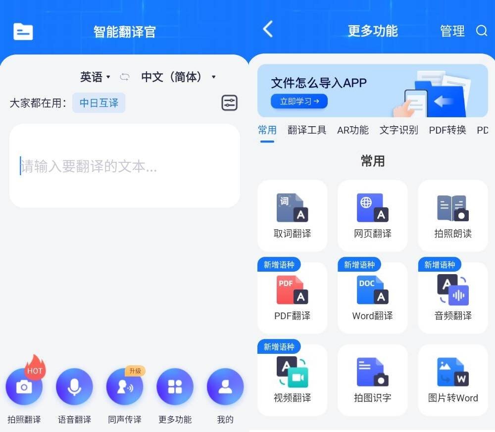 智能翻译官是一款具备多语种翻译能力的掌上翻译器,本app支持文本翻译、拍照翻译、语音翻译、实时同声传译等多种翻译模式。对于翻译后的文字还能进行编辑、内容复制、翻译、实时校对、重新翻译、导出等操作。产品还内置了文字转语音、语音转文字等多种实用办公功能。作为一款上线的多语种翻译产品,我们一直致力于给用户好的体验。