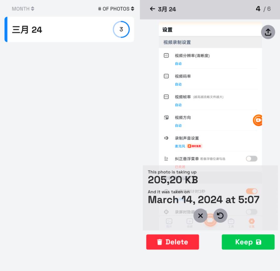 Swipe & Delete是一款非常简单实用的手机图片整理工具,可以帮助用户快速地删除不需要的文件和数据。只需要在应用中进行滑动操作,就可以轻松地删除照片、视频、文档等文件,省去了繁琐的操作步骤,左滑删除,右滑保留,按月选择,干净利落,非常方便便捷。感兴趣的小伙伴赶紧下载这款手机图片清理工具吧。