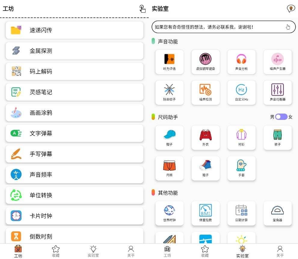 一个工坊是一款轻便无负担、零权限、实用功能超级多的手机应用工具,灵感笔记、画画涂鸦、文字弹幕、手写弹幕、声音频率、单位转换等多项实用功能集一身。灵活清单、创意绘画、独特弹幕,还有声音实验室等功能,满足您在备忘录、创作和科研方面的各种需求。操作简单,更有趣味实用工具,如卡片时钟和倒数时刻。