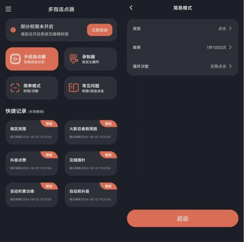 屏幕自动点击:帮助广大安卓用户解放双手,实现短时间内连续点击加速,轻松设置点击频率;一键录制,自动重复操作,轻松实现按键精灵的效果!