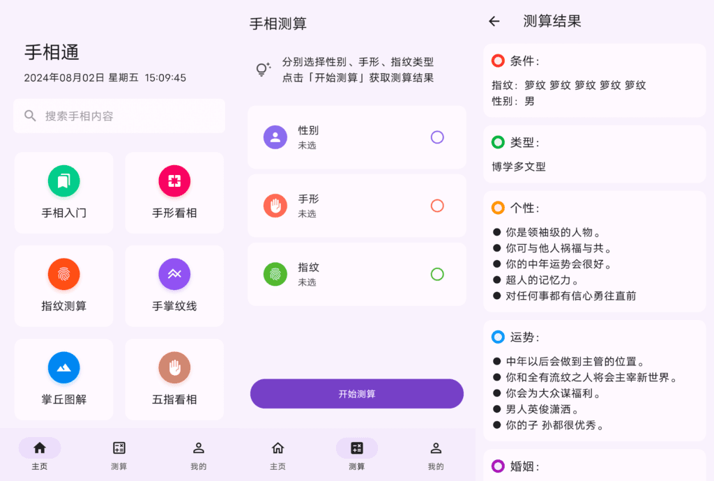 手相通是一款功能很全面的看手相的软件,手相通APP安卓最新版,支持看手相,算手相,解析手相,图解手相,手相算命等操作,软件功能很强,没有广告,下载安装后就可以直接使用,轻松操作,支持手掌纹线,指纹测算等等,简洁好用。