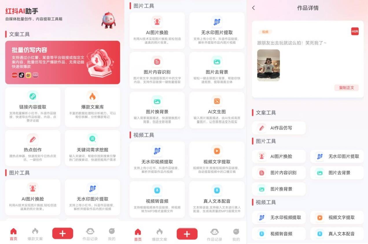 红抖ai助手可以仿写热门文章,去水印,音频转换,字幕功能,其他几个都是去视频水印,完全免费,放心使用!