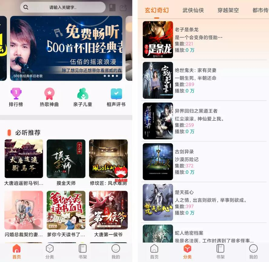 声阅和之前分享过的蓝莓听书差不多,也是整合了有声小说、热歌神曲、亲子儿歌以及相声评书四大板块有声资源。